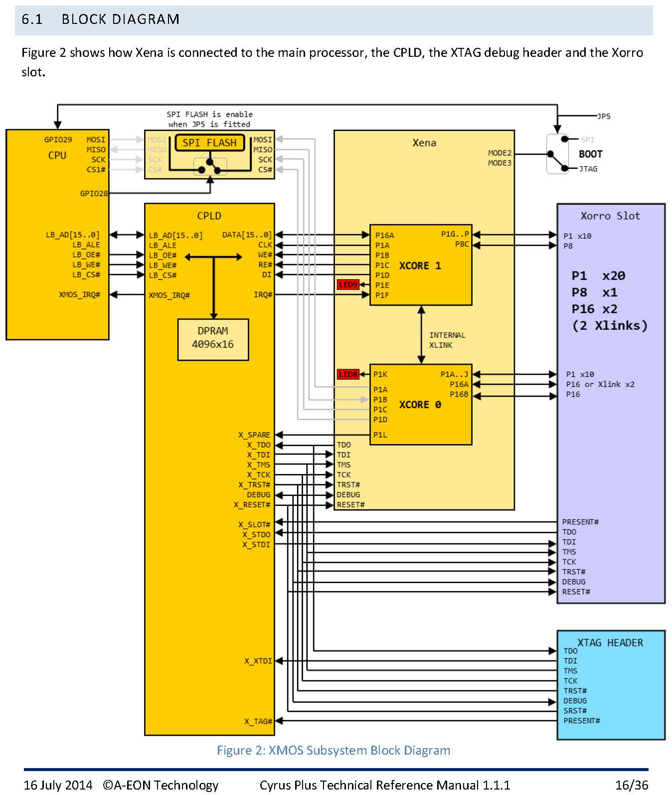 Instead, the Xorro is connected directly to the on-board Xena chip via a series of Input/Output Ports as well as to the Xena's XLinks ports which allow it to connect to a daisy-chain of additional XMOS chips. This block diagram from the AmigaONE X5000 Technical Reference Manual (TRM) (reproduced here by permission from A-EON) gives us an idea of how the Xena chip connects to both the Xorro slot and the main CPU.