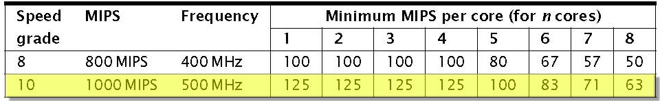 The Xena chip contains two processor cores, called "xCORE Tiles" and 16 "xCORE logical cores" (eight per Tile). It is clocked from a 25Mhz oscillator with its Phase-Locked Loop (PLL) configured for x20 operation, thus clocking the Xena chip at 500Mhz. The following chart details how the total rate of 1000 MIPS per Tile is distributed between the Logical Cores on that Tile. According to the XS1-L16A-128-QF124 Datasheet, if up to four logical cores are active then the available processing cycles are divided between the four cores, or in this case the first four cores each get 125 MIPS. Now, if more than four cores are active on the Tile, then the cycles are *at least* 1/n cycles for n cores, or in this case 5 cores get 100 MIPS each, 6 get 83 MIPS each, 7 gets 71 MIPS each, and if all eight cores are executing simultaneously on a given Tile, then they each get 63 MIPS.