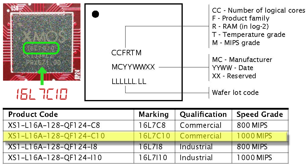 Taking a quick photo of the Xena chip on the AmigaONE X5000 and comparing the numbers on the chip with the "Part Marking" legend from XMOS, we deduce the following: the Xena chip is an 16L7C10. '16' for 16 Logical Cores, 'L' for the XMOS "General Purpose" product family, '7' indicates the RAM (in this case 128KB Total, 64KB in each Tile), 'C' for Commercial (Temperature grade), and '10' which notes the MIPS rating (in this case 1000 MIPS). According to the "Ordering Information" guide from XMOS, our chip's product code is "XS1-L16A-128-QF124-C10." Using this product number we can find out a great deal more about this chip. A quick Google search on this product number returns several items, most notably the direct download link for the XS1-L16A-128-QF124 Datasheet on the www.xmos.com website.